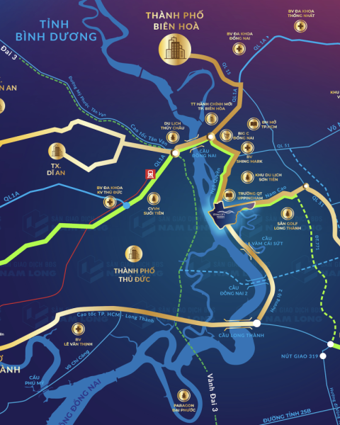 Vị trí "Tâm điểm vàng" kết nối đa chiều Izumi City tọa lạc tại xã Long Hưng, TP. Biên Hòa, tỉnh Đồng Nai – vị trí trung tâm của quần thể các khu đô thị sinh thái sầm uất phía Đông TP.HCM. Dự án sở hữu lợi thế "nhất cận thị, nhị cận giang, tam cận lộ" khi nằm ngay mặt tiền đường Hương Lộ 2 (lộ giới 60m), kết nối trực tiếp vào cao tốc TP.HCM – Long Thành – Dầu Giây. Nhờ hạ tầng hoàn thiện với cầu Vàm Cái Sứt, cư dân chỉ mất khoảng 25 phút để di chuyển về Trung tâm Thủ Thiêm và dễ dàng tiếp cận Sân bay quốc tế Long Thành trong tương lai. Đặc biệt, với đường bờ sông dài bao bọc, vị trí này không chỉ mang lại kết nối giao thông hoàn hảo mà còn thừa hưởng tầm nhìn khoáng đạt và phong thủy tài lộc vững bền.